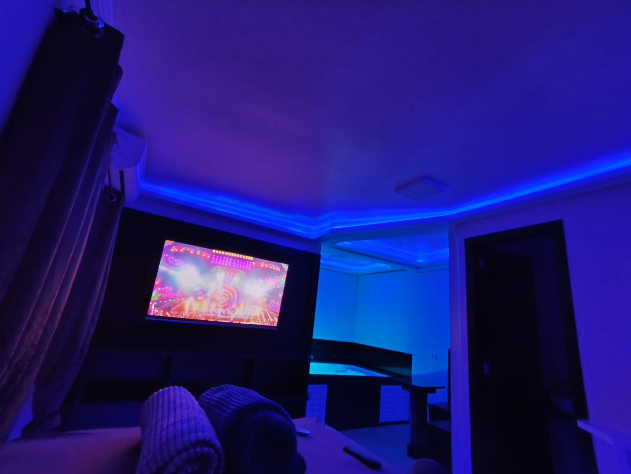 💡 Iluminação neon azul que transforma o clima com um toque moderno e envolvente